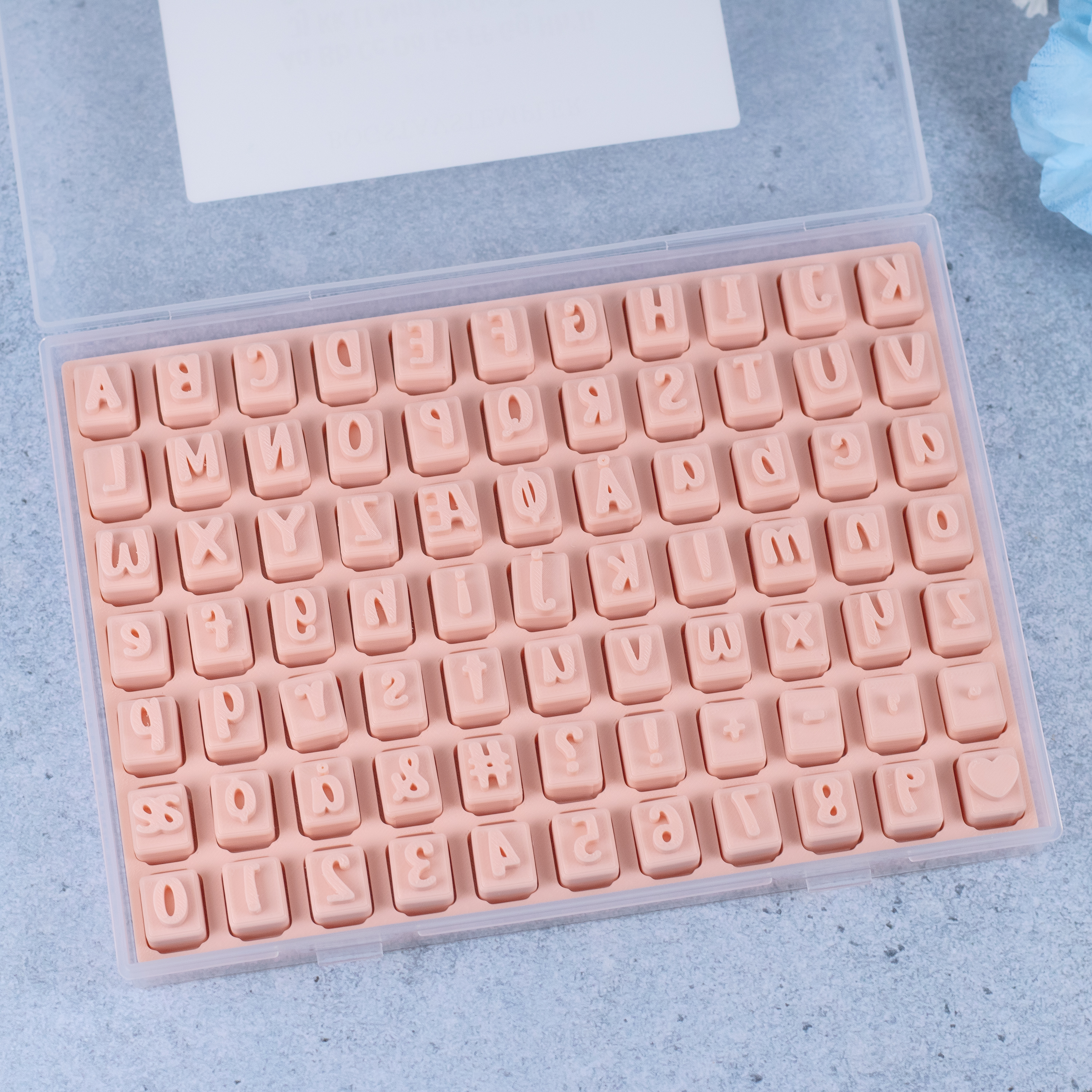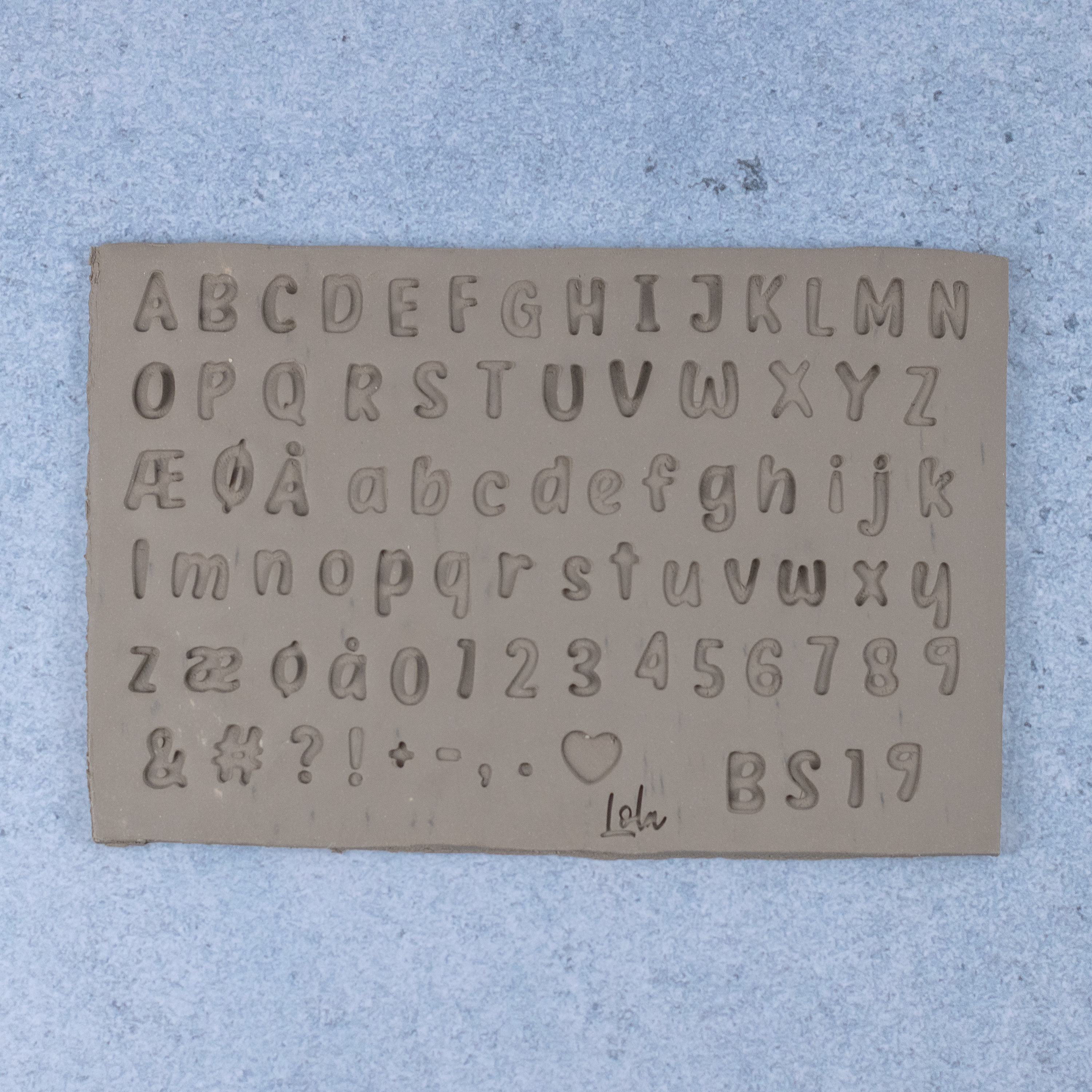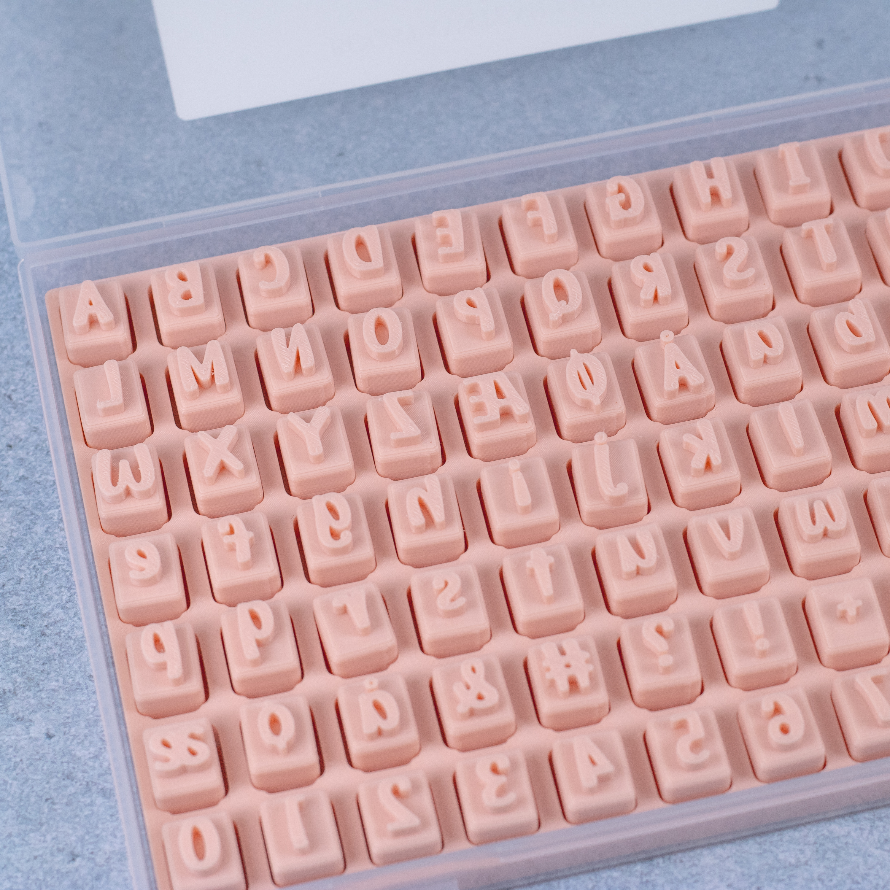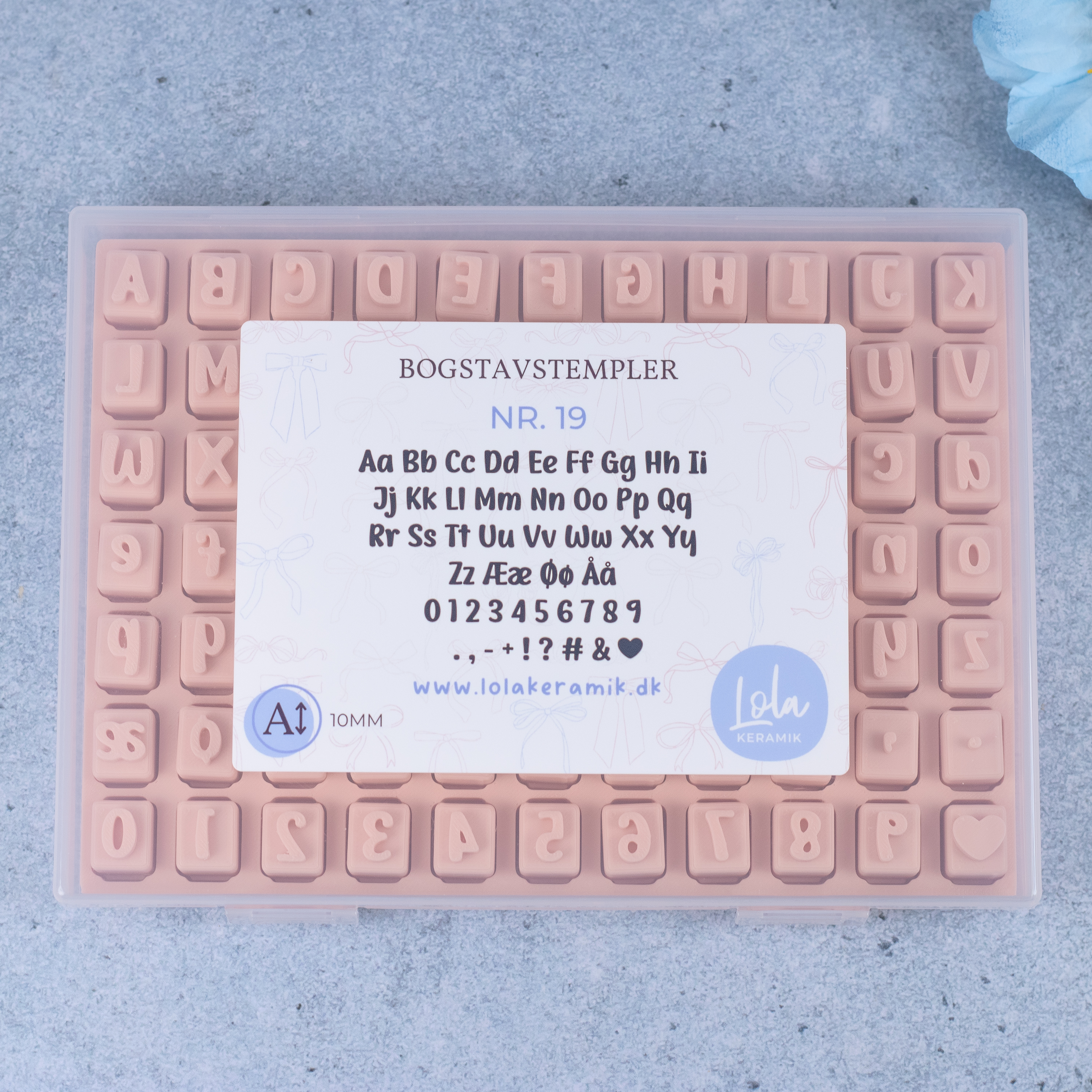 10mm bogstavstempler med hele det danske alfabet i både store og små bogstaver A-Å og a-å, tal 0-9, otte tegn samt et hjerte, i alt 77 stempler.