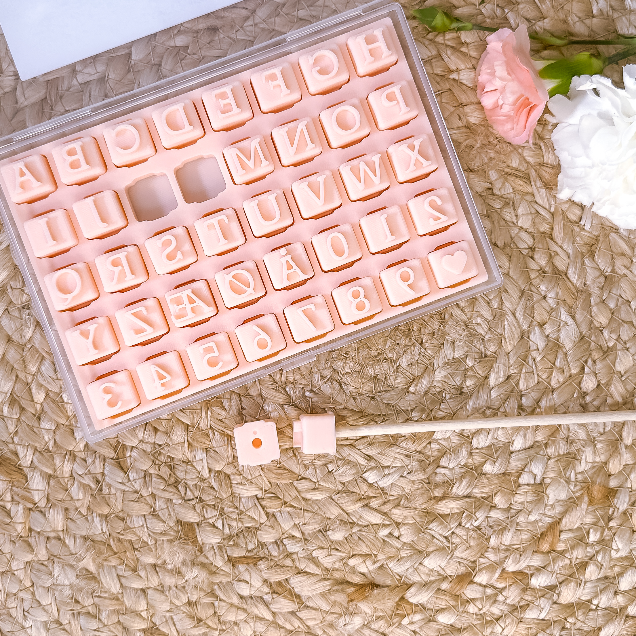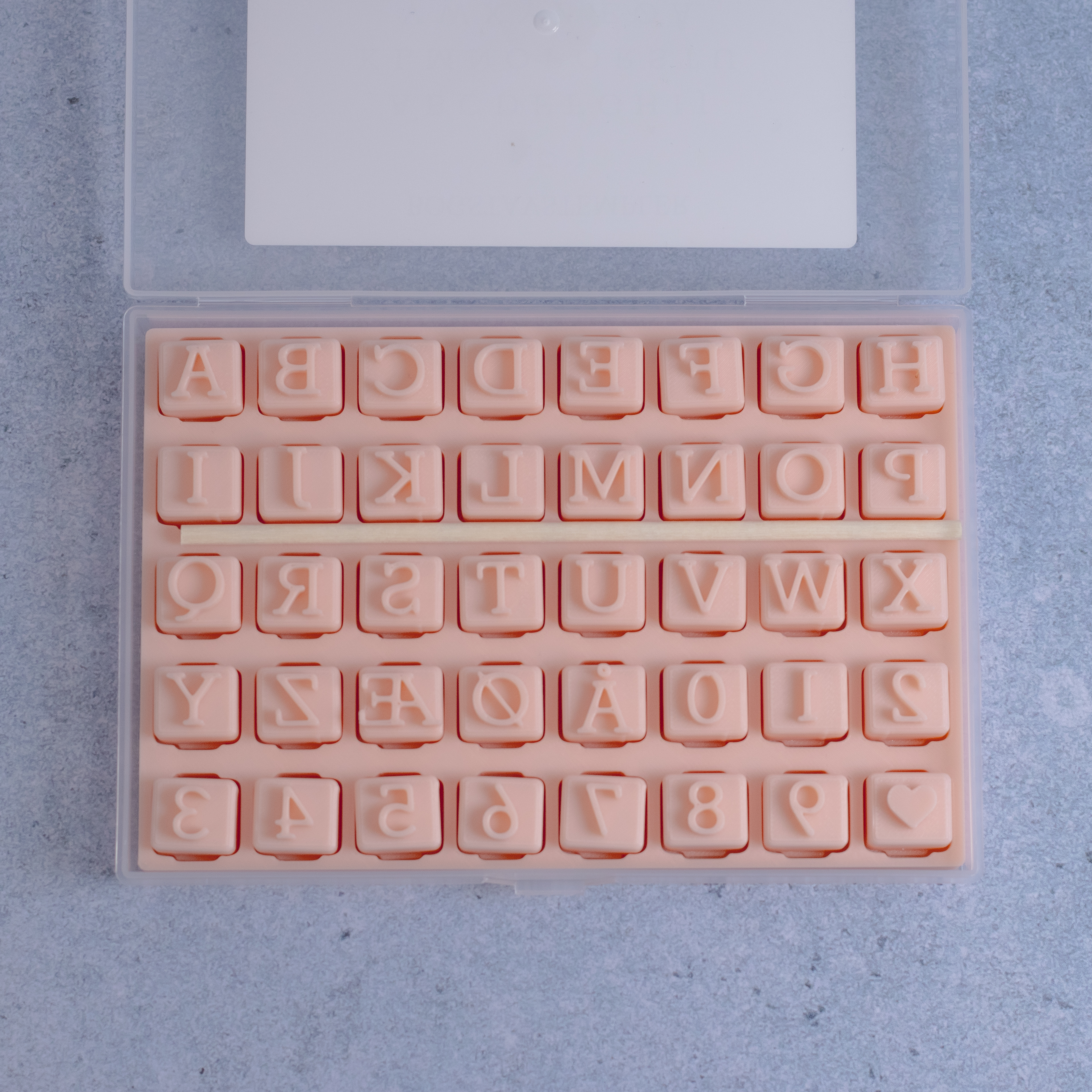 Stemplerne leveres i en praktisk plastik æske, med en indsats til stemplerne, så man hurtigt kan finde det rigtige bogstav.