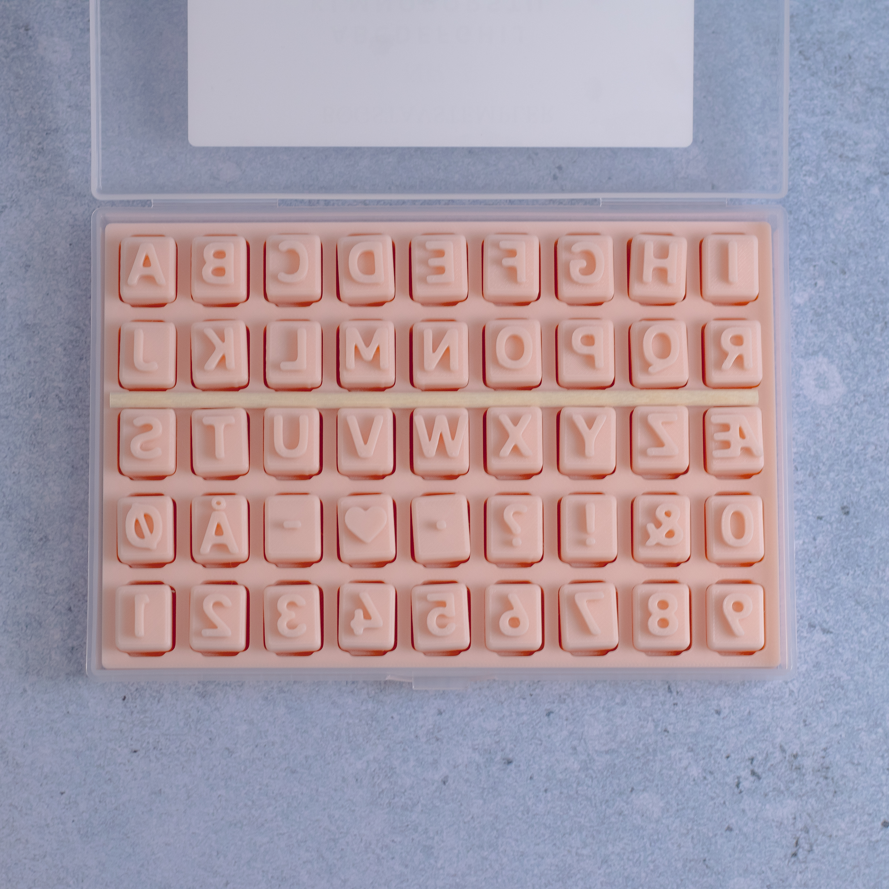 Stemplerne leveres i en praktisk plastik æske, med en indsats til stemplerne, så man hurtigt kan finde det rigtige bogstav.