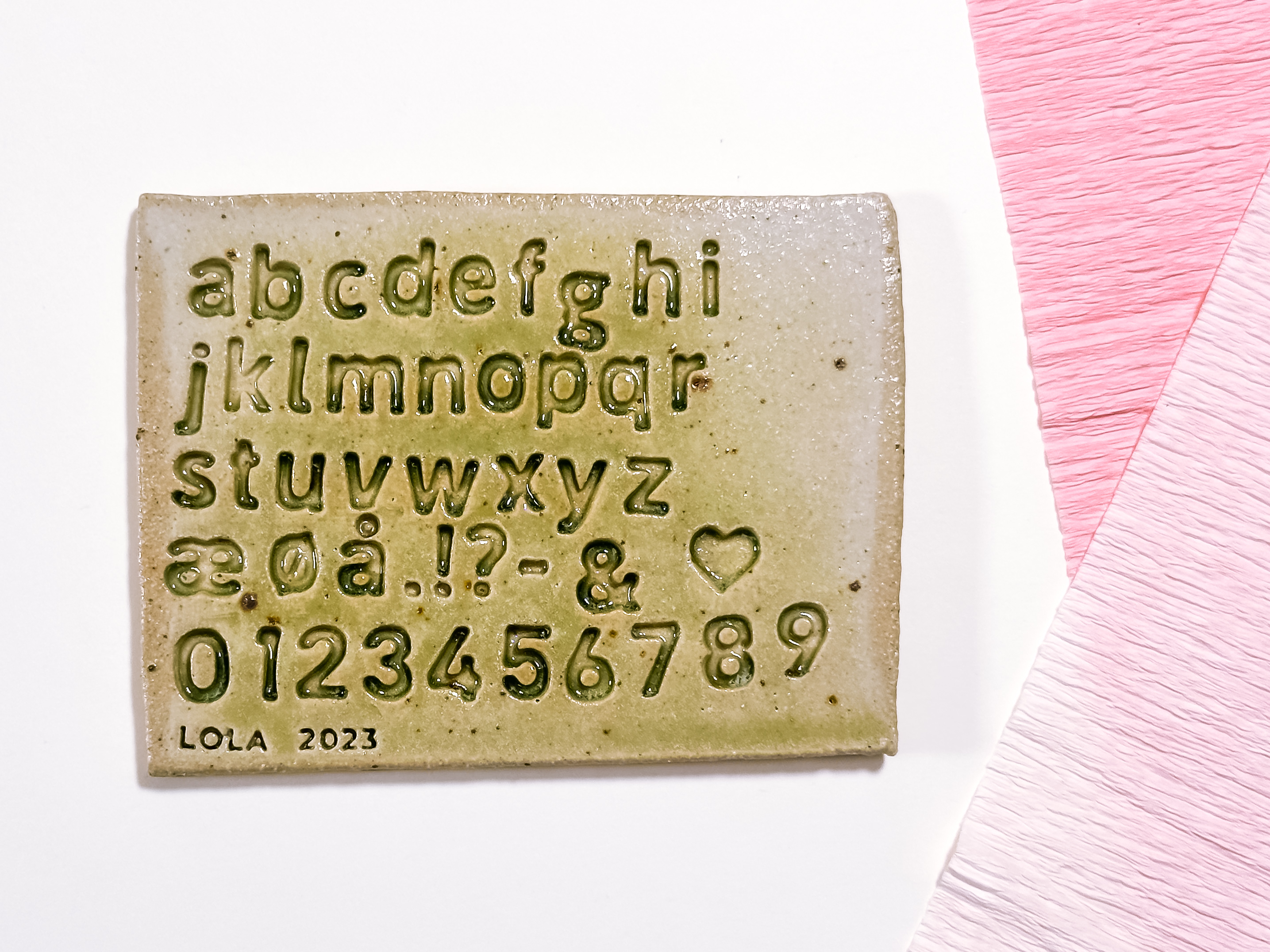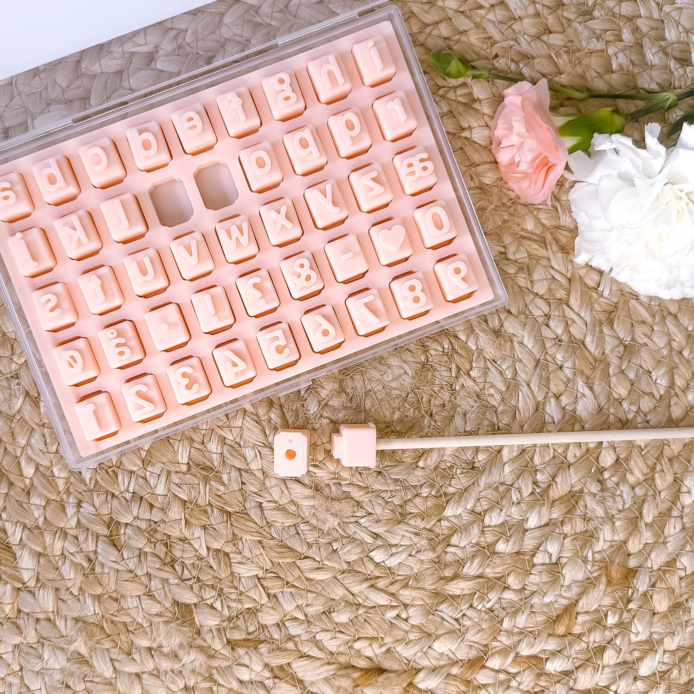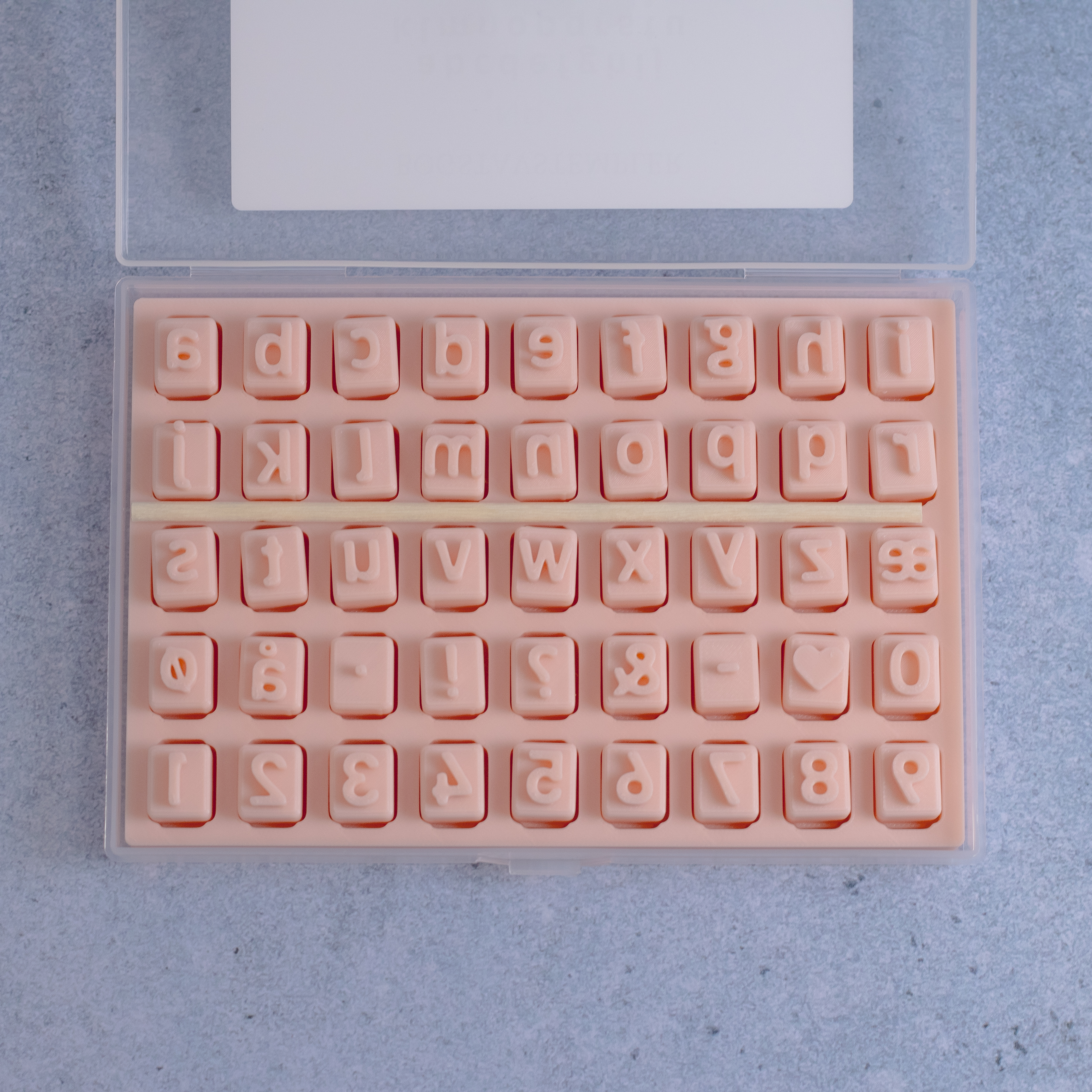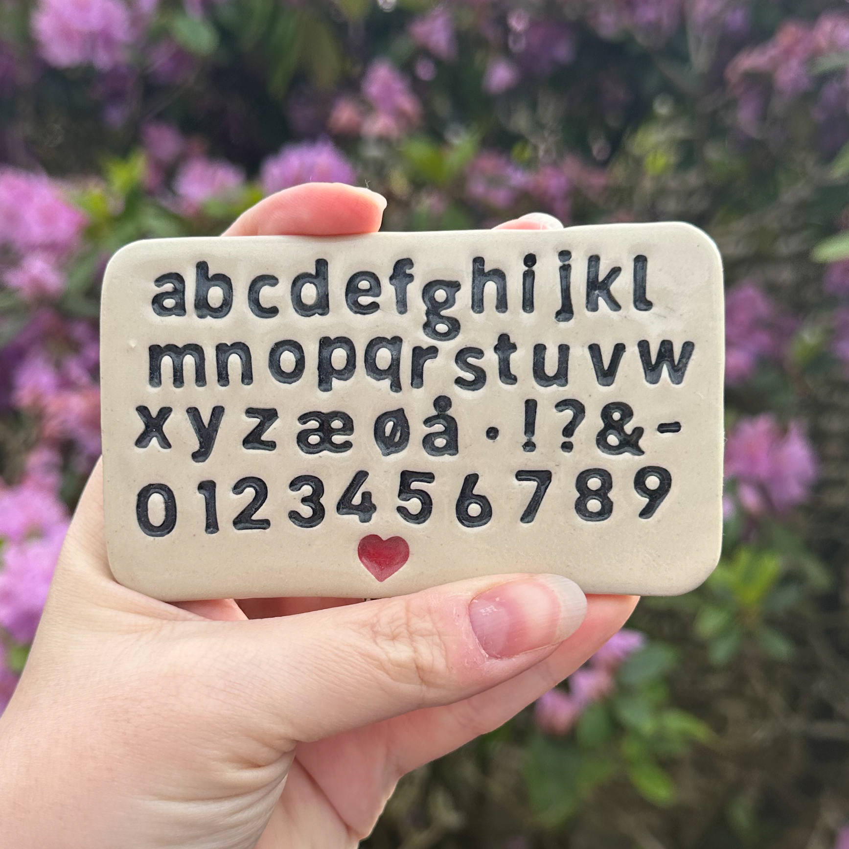 10mm bogstavstempler med hele det danske alfabet, fra A-Å i små bogstaver, tal 0-9, fem tegn samt et hjerte, i alt 45 stempler.