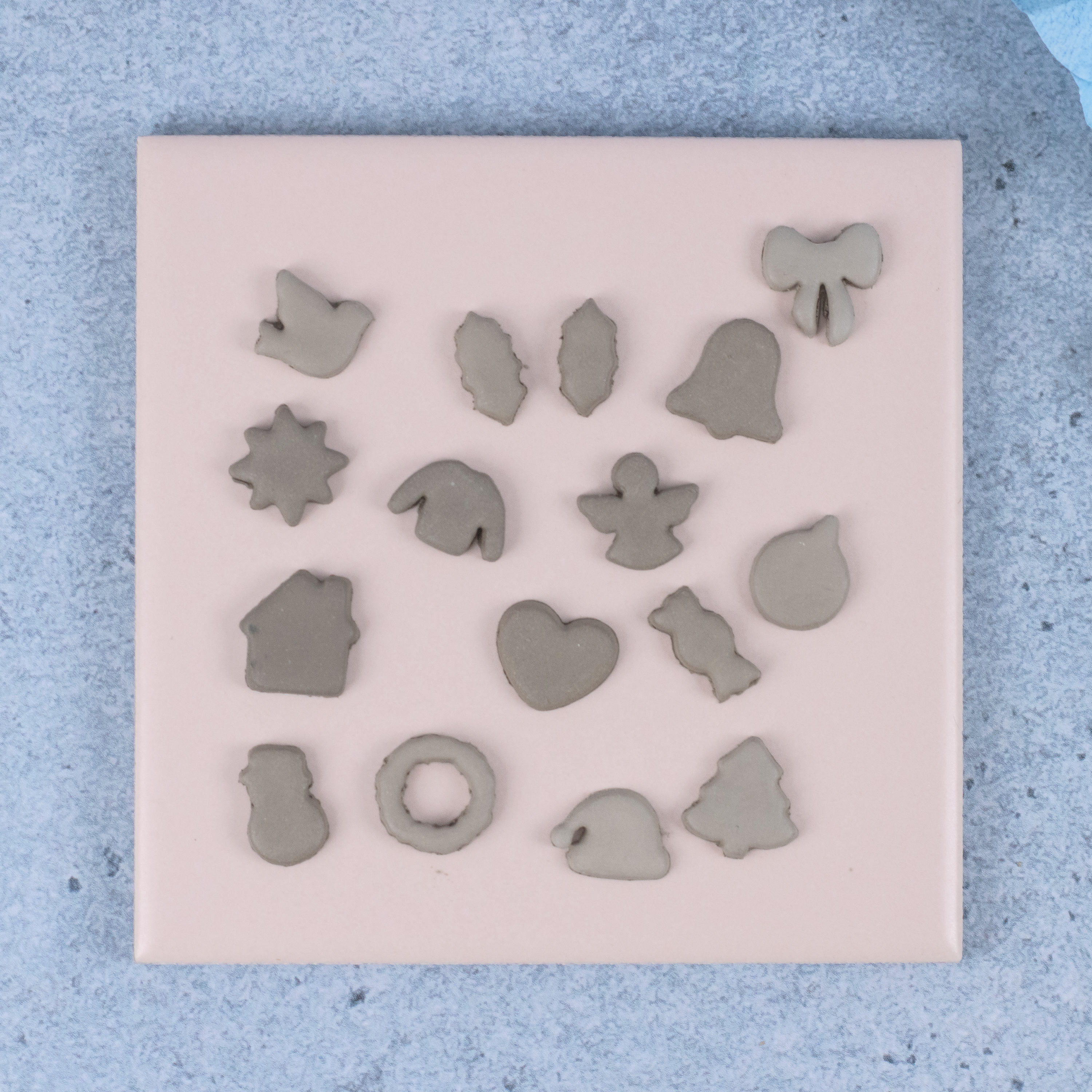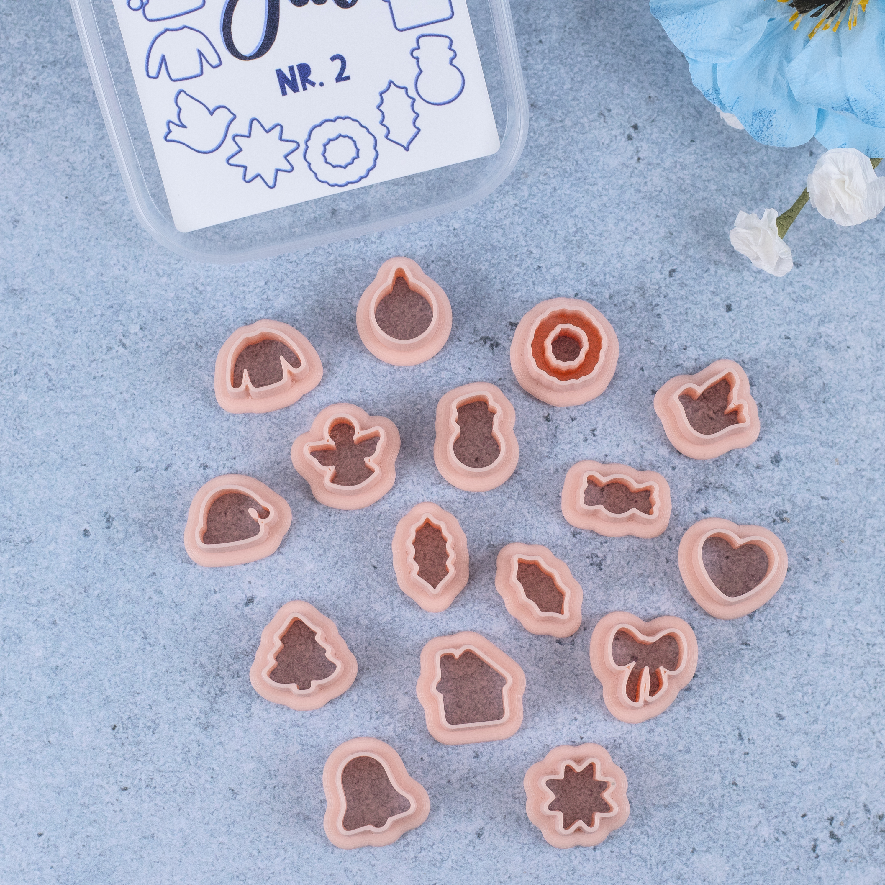 Sættet indeholder: Sløjfe, julekugle, juletræ, juleklokke, bolsje, hus, snemand, 2 x kristtorn, krans, stjerne, due, sweater, nissehue, hjerte og engel.