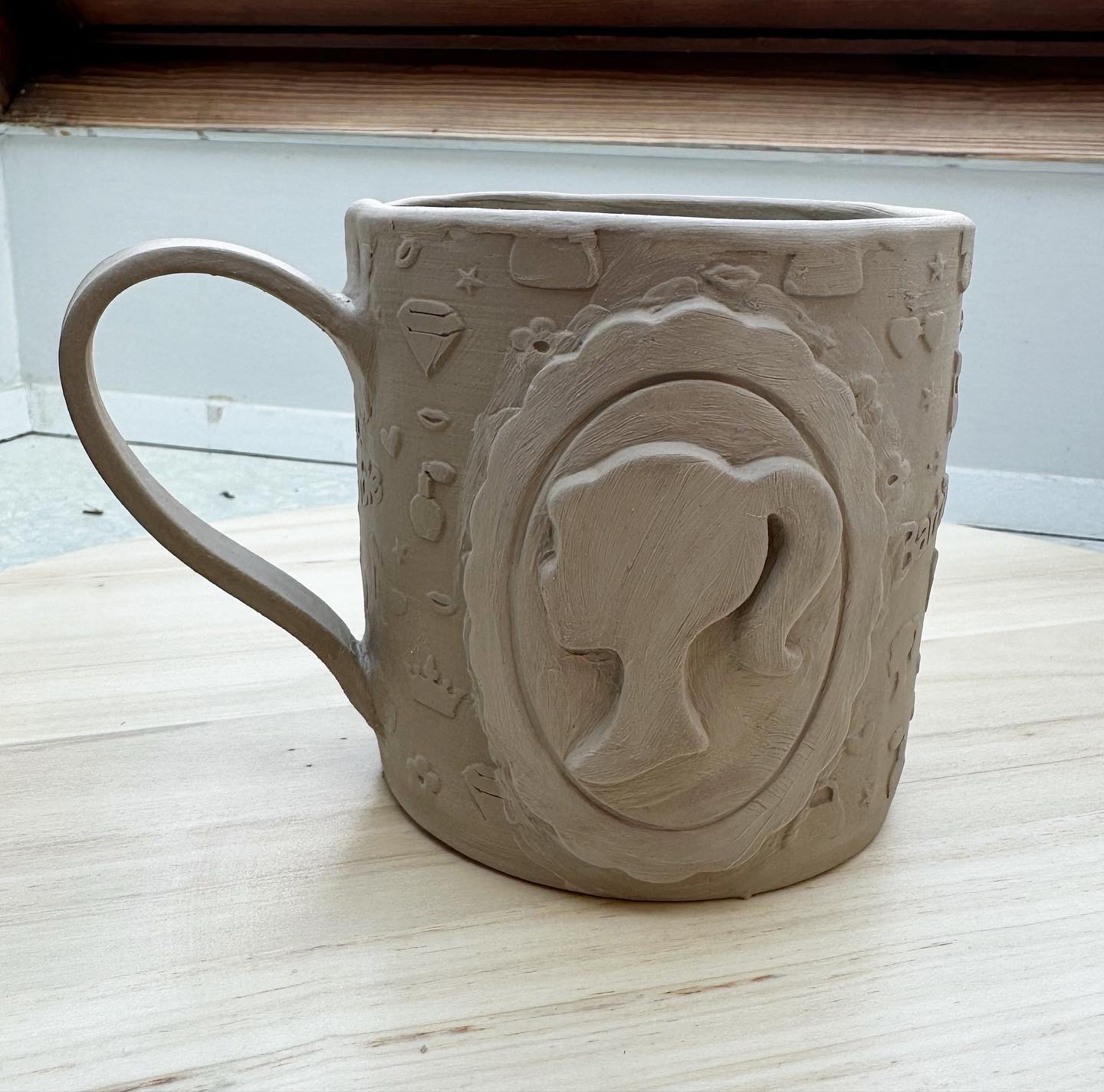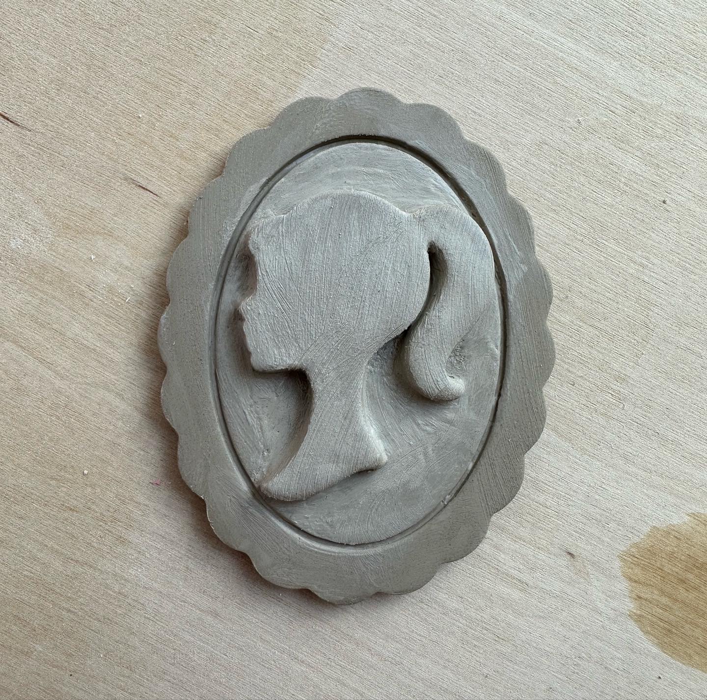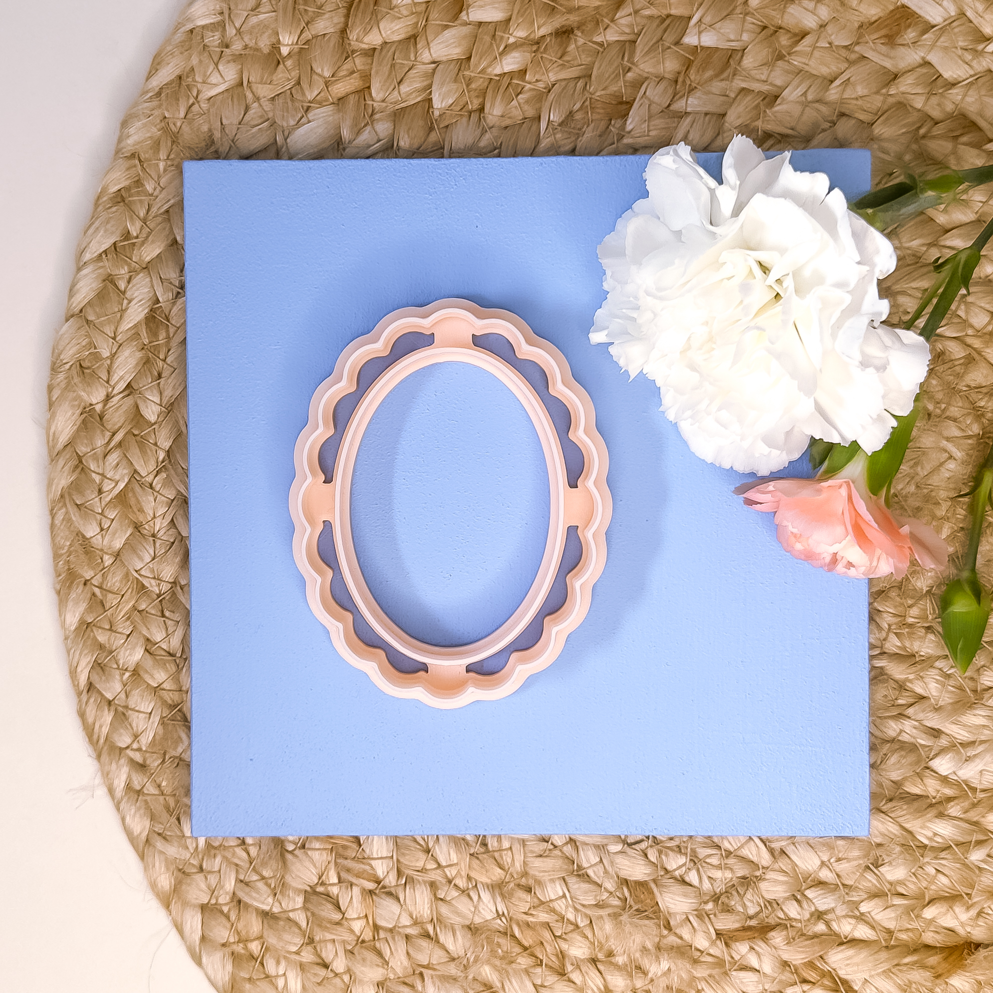 Denne ovale bølgede ramme udstikker med prægning måler 80x62mm. Denne udstikker præger 3mm fra udstikker kanten. Dvs. på en 4mm lerplade, præger den 1mm dybt, på en 5mm lerplade præger den 2mm dybt osv.