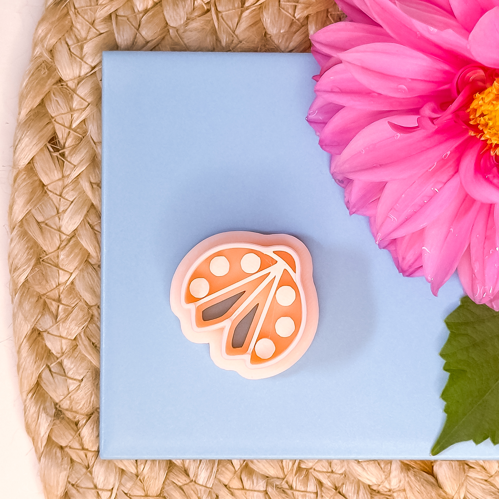 Denne mariehøne udstikker med prægning måler 30x29mm. Udstikkeren er lavet ud fra en håndtegnet illustration. Denne udstikker præger 3mm fra udstikker kanten. Dvs. på en 4mm lerplade, præger den 1mm dybt, på en 5mm lerplade præger den 2mm dybt osv.